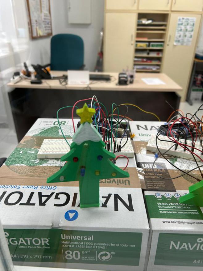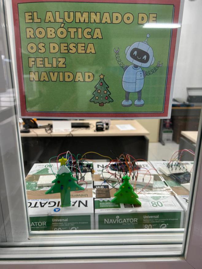 ¡El alumnado de robótica ha querido sumarse al Día de la Solidaridad diseñando, fabricando y programando estos árboles navideños y carteles con diodos LED y zumbadores que hacen sonar alegres villancicos. ¡Feliz Navidad!